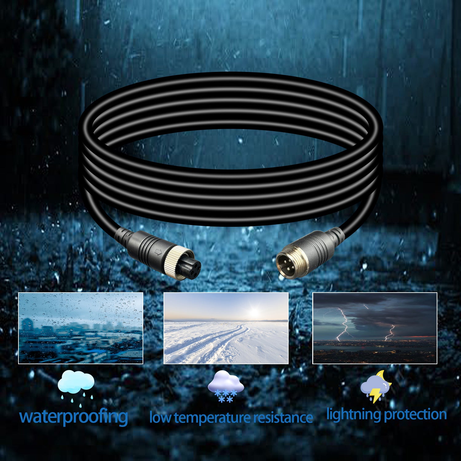 - Application Scenario: 4-pole reversing camera extension cable is snowproof, waterproof and shockproof, and can be used for outdoor applications even in extreme weather. It can be used for a variety of applications such as automobiles, construction machinery and agricultural equipment