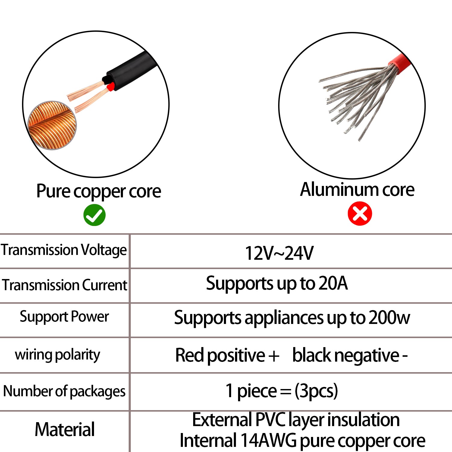 - Material: DC DC pigtail power cord External double thickened PVC Tail end tinned Easy to solder Internal pure copper core made 14AWG cable is thicker Highly conductive, safe and stable Can be used for DC equipment under 24V