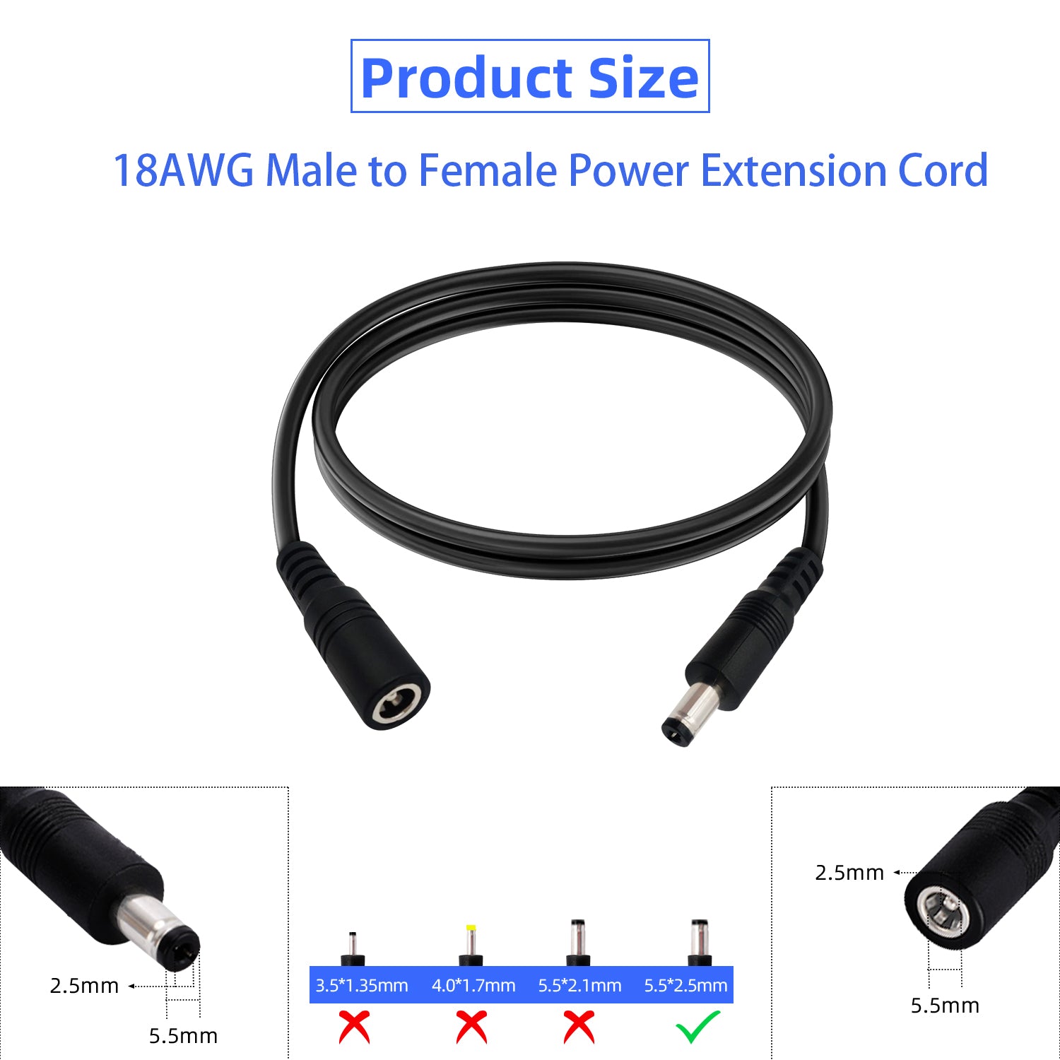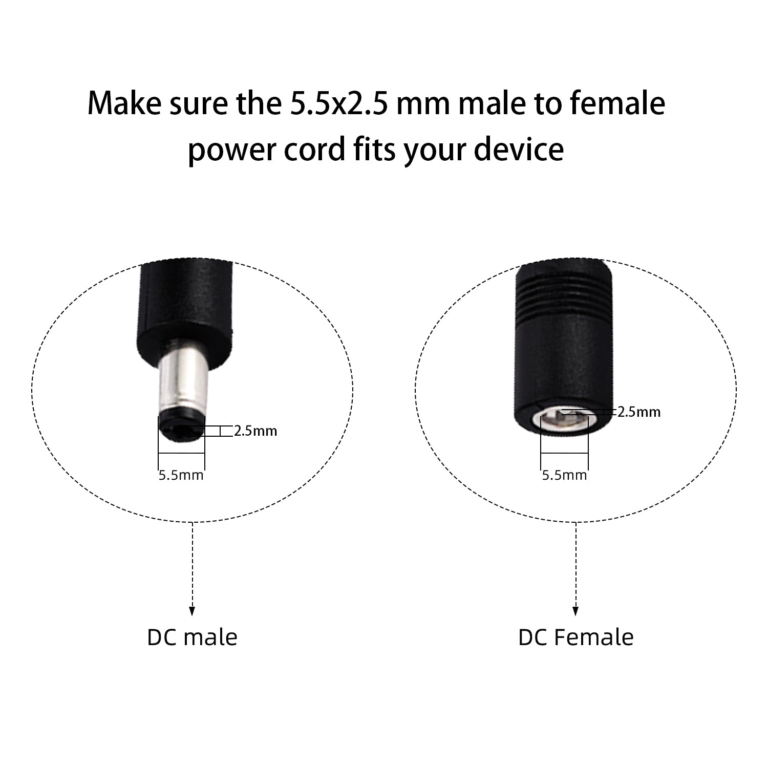 5.5x2.5mm 12 Volt, DC Power Extension Cord, Barrel Connector for Battery Packs, Routers, LED Strips, Projectors, Printers, Home Cameras, etc.