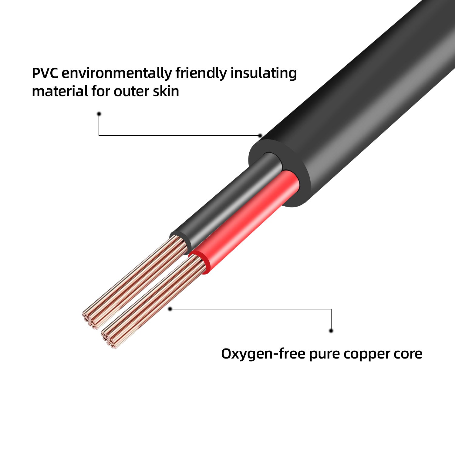 - Product material; external PVC environmentally friendly insulation material, internal oxygen-free pure copper core with high temperature resistance, wear resistance, high conductivity, high stability, safety and reliability.