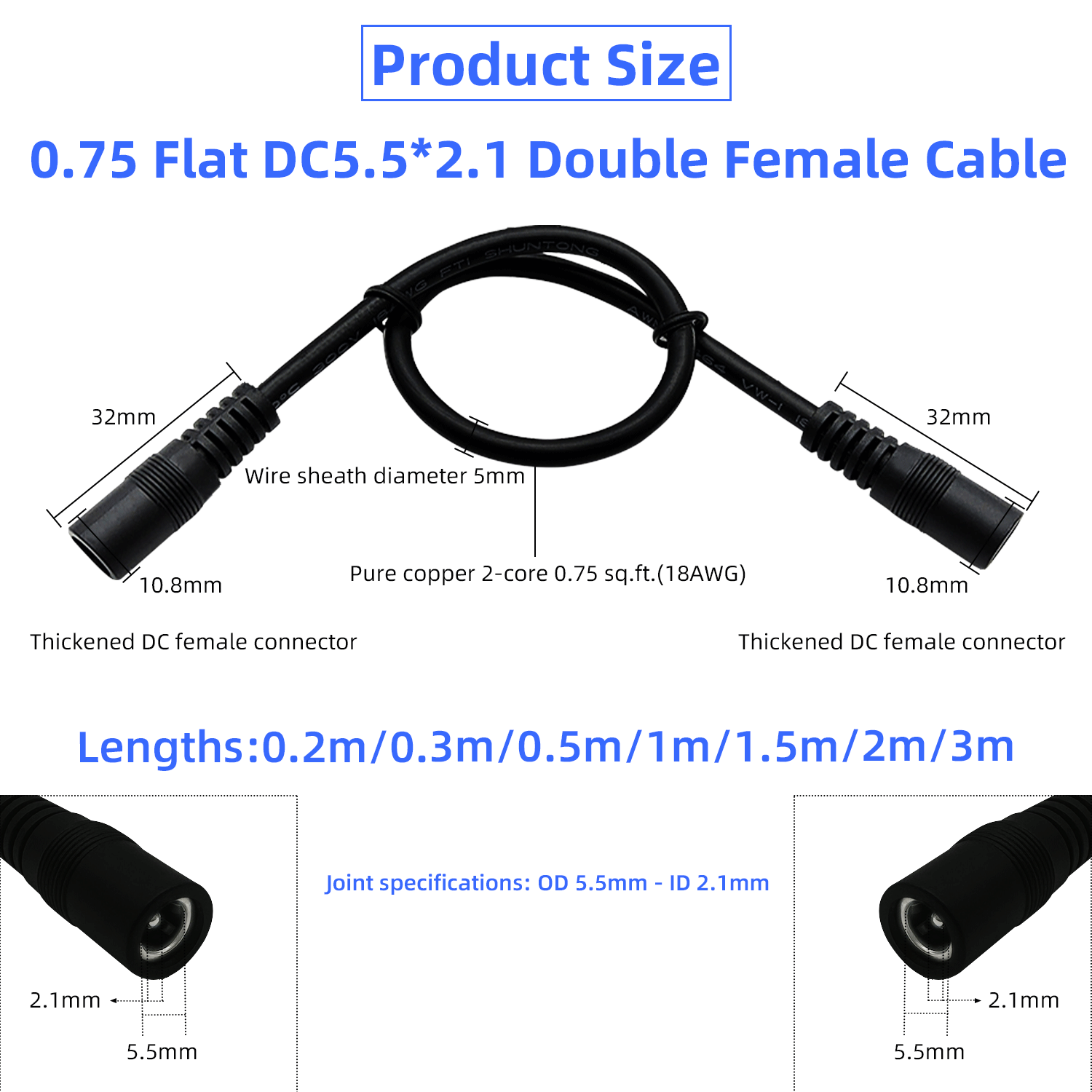 DC5.5x2.1mm Female to Female 12V 5A Barrel Connector, 18AWG, 12V Power Extension Cord