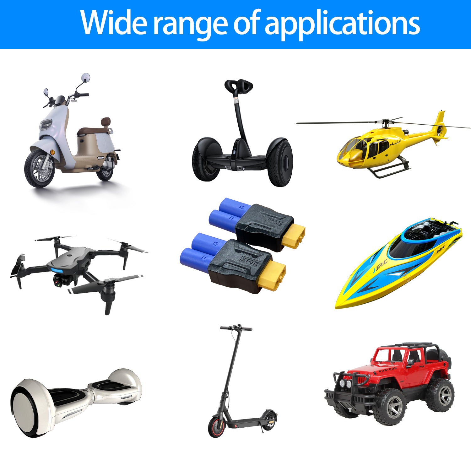 - Widely used: XT60 to EC5 connectors Plugs for converting batteries, ESCs on FPV drones RC vehicles Chargers Power distribution boards Energy storage power supplies Solar panels